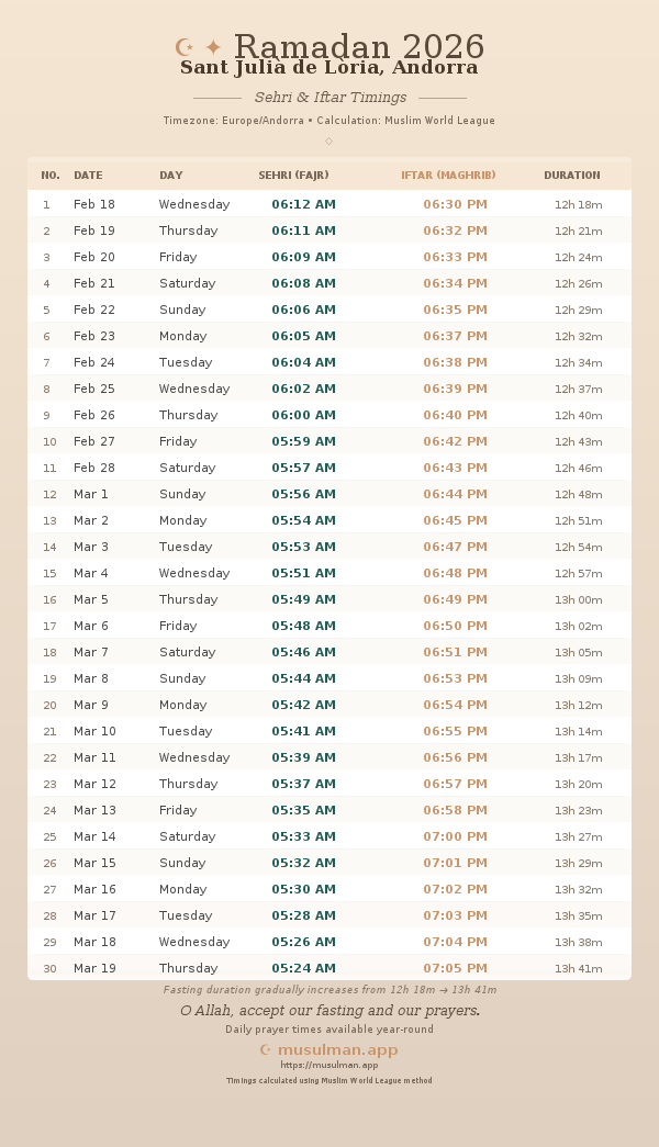 Sehri & Iftar Timings - Sant Julià de Lòria, Andorra