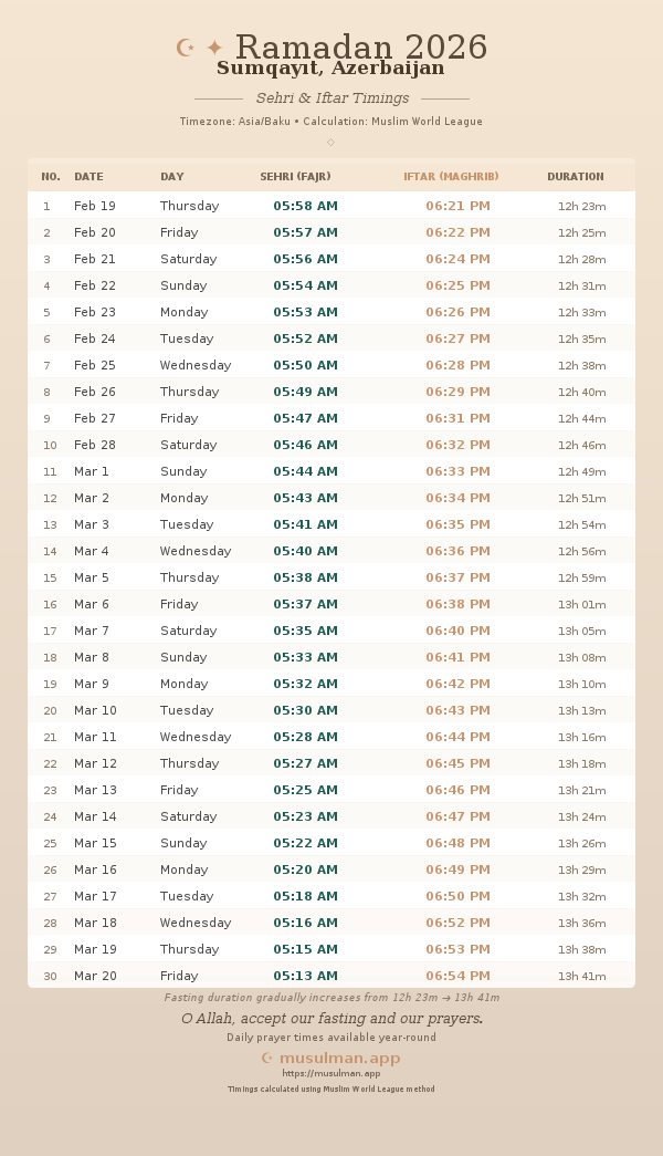 Sehri & Iftar Timings - Sumqayıt, Azerbaijan