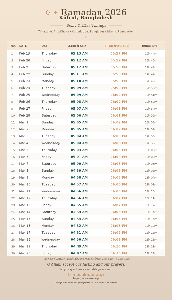 Sehri & Iftar Timings - Kāfrul, Bangladesh