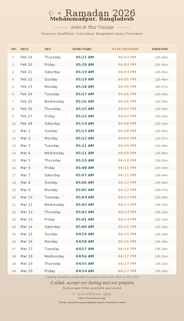Sehri & Iftar Timings - Mohāmmadpur, Bangladesh