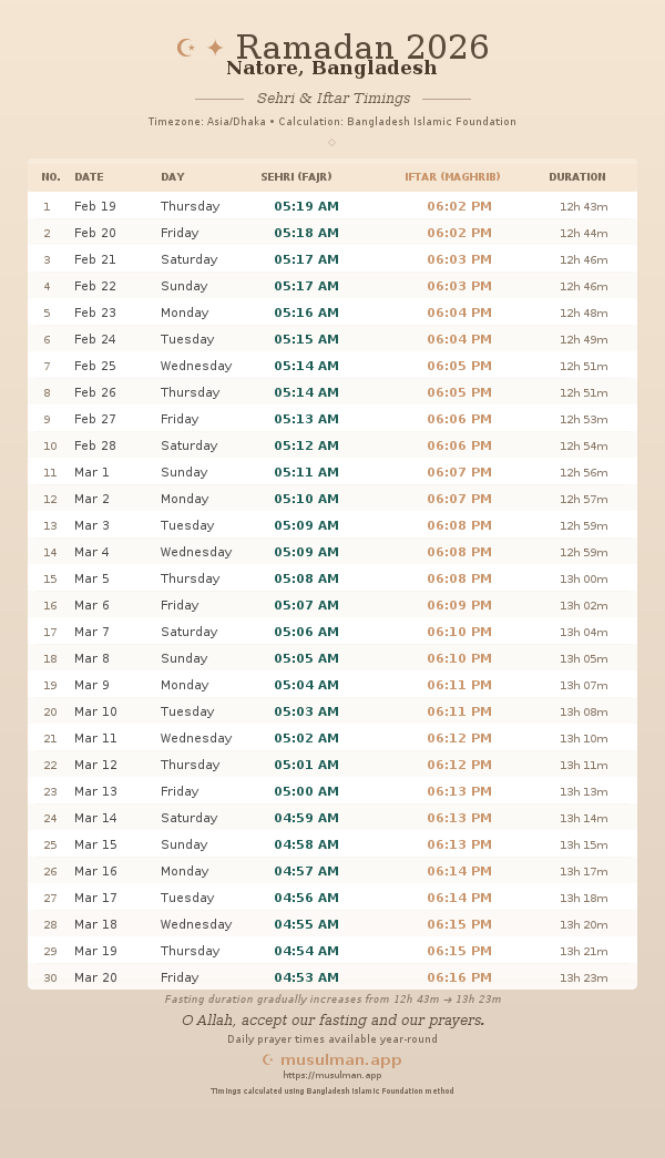 Sehri & Iftar Timings - Natore, Bangladesh
