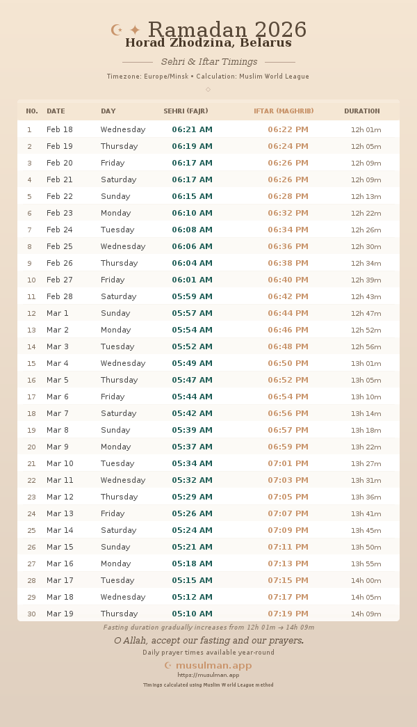 Sehri & Iftar Timings - Horad Zhodzina, Belarus
