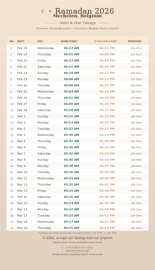 | No. | Date | Day | Sehri (Fajr) | Iftar (Maghrib) | Duration |