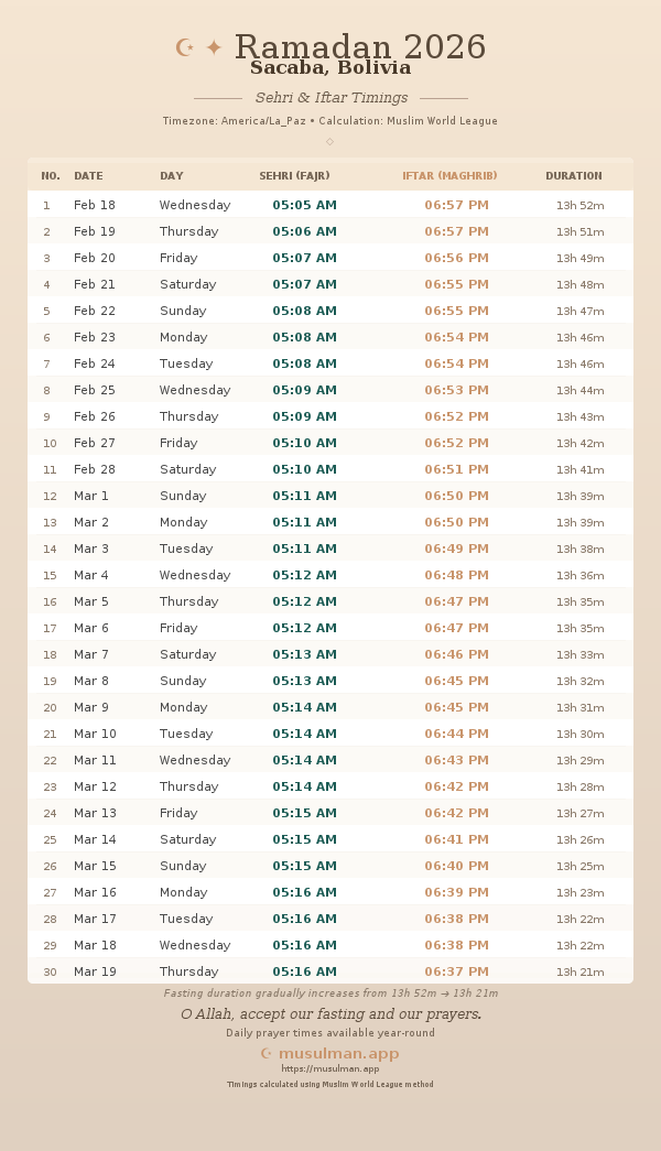 Sehri & Iftar Timings - Sacaba, Bolivia