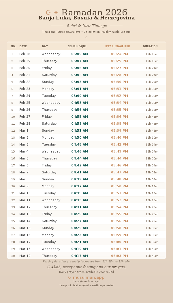 Sehri & Iftar Timings - Banja Luka, Bosnia & Herzegovina
