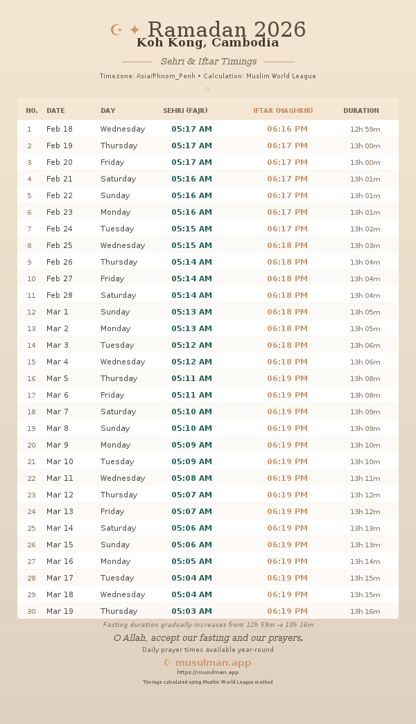 Sehri & Iftar Timings - Koh Kong, Cambodia
