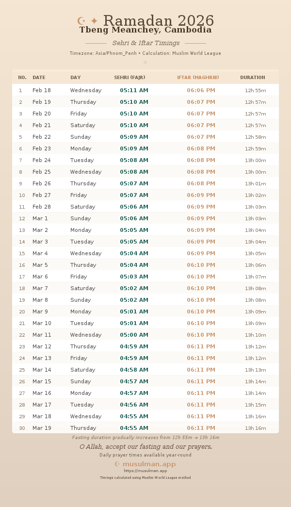Sehri & Iftar Timings - Tbeng Meanchey, Cambodia