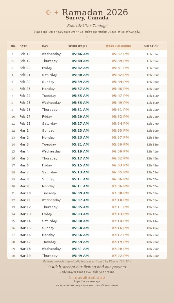 Sehri & Iftar Timings - Surrey, Canada