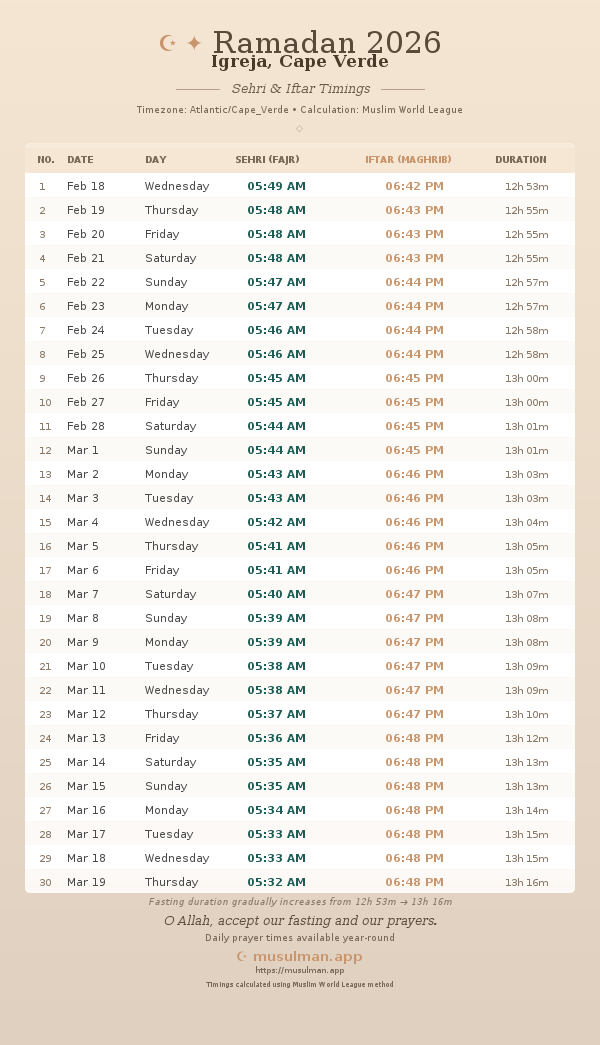 Sehri & Iftar Timings - Igreja, Cape Verde