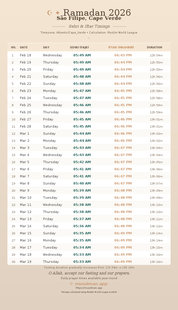 Sehri & Iftar Timings - São Filipe, Cape Verde