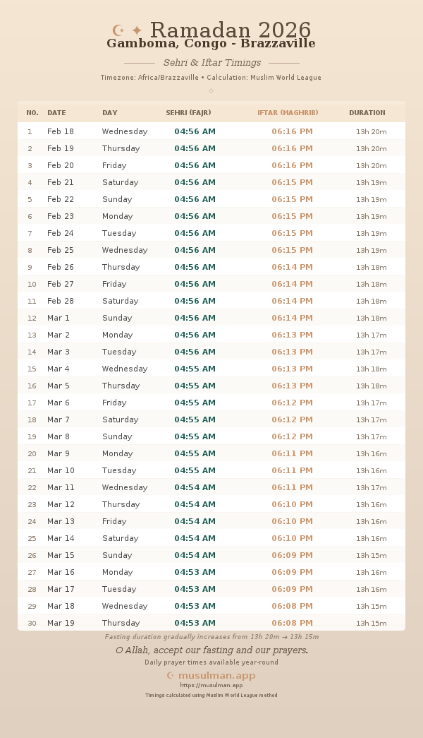 Sehri & Iftar Timings - Gamboma, Congo - Brazzaville