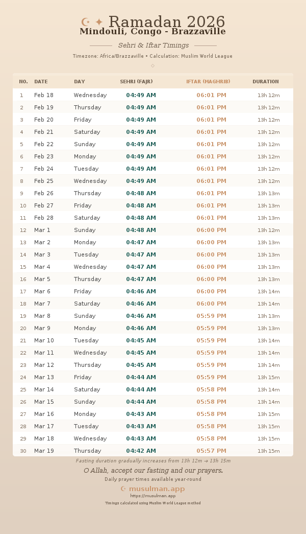 Sehri & Iftar Timings - Mindouli, Congo - Brazzaville