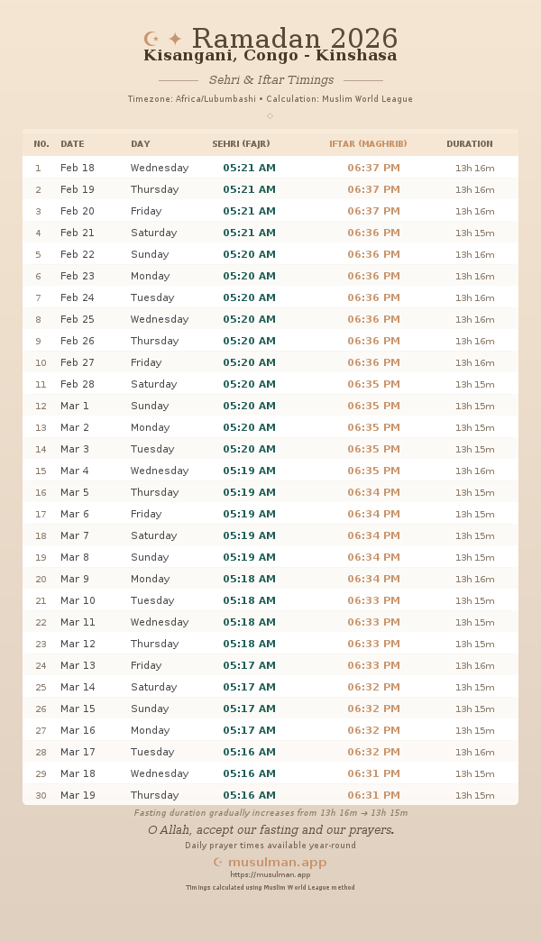 Sehri & Iftar Timings - Kisangani, Congo - Kinshasa