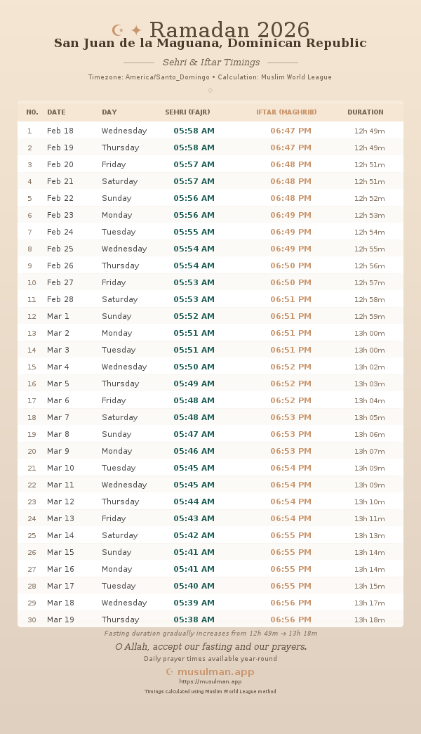 Sehri & Iftar Timings - San Juan de la Maguana, Dominican Republic