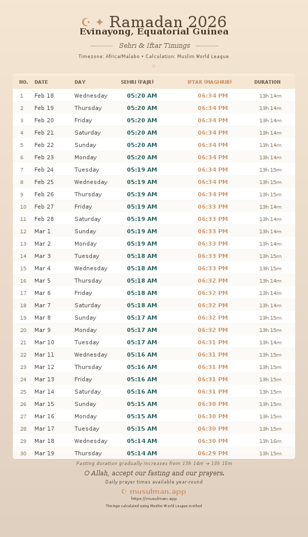 Sehri & Iftar Timings - Evinayong, Equatorial Guinea