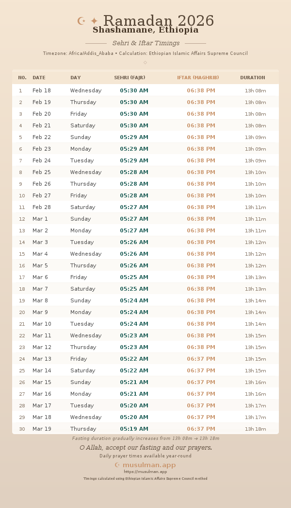 Sehri & Iftar Timings - Shashamane, Ethiopia