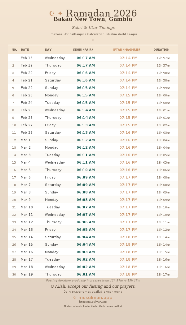 Sehri & Iftar Timings - Bakau New Town, Gambia