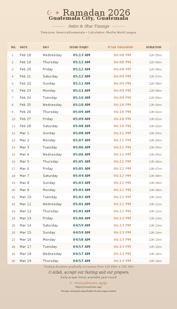 Sehri & Iftar Timings - Guatemala City, Guatemala
