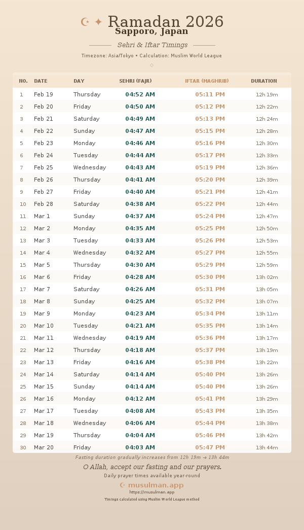 Sehri & Iftar Timings - Sapporo, Japan