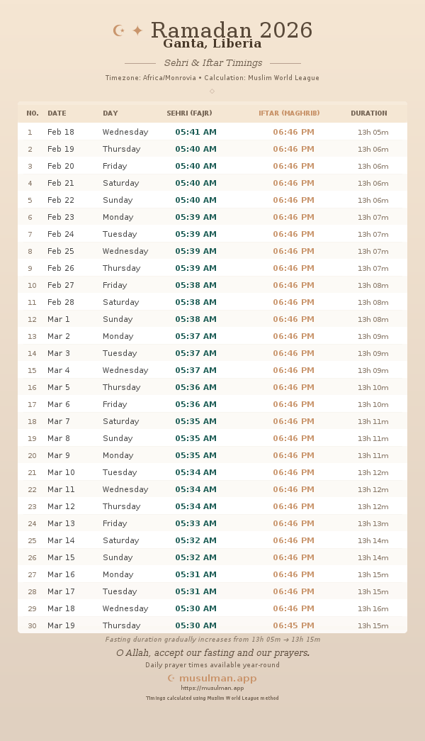 Sehri & Iftar Timings - Ganta, Liberia