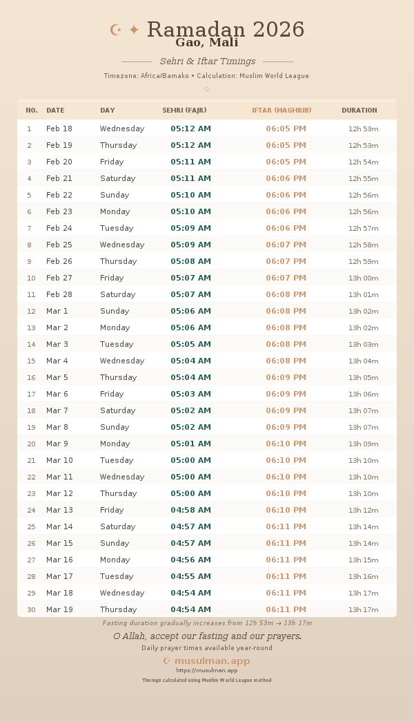 Sehri & Iftar Timings - Gao, Mali