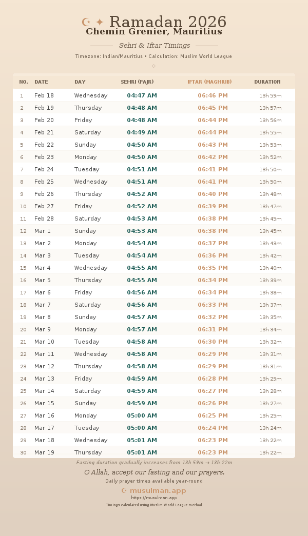 Sehri & Iftar Timings - Chemin Grenier, Mauritius