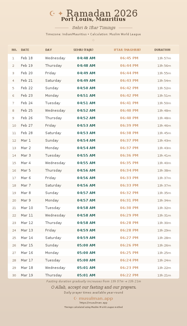 Sehri & Iftar Timings - Port Louis, Mauritius