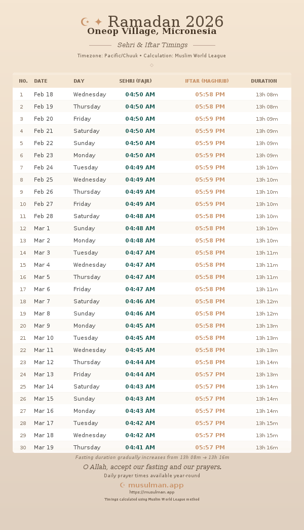 Sehri & Iftar Timings - Oneop Village, Micronesia