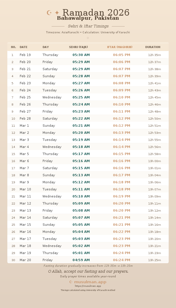 Sehri & Iftar Timings - Bahawalpur, Pakistan