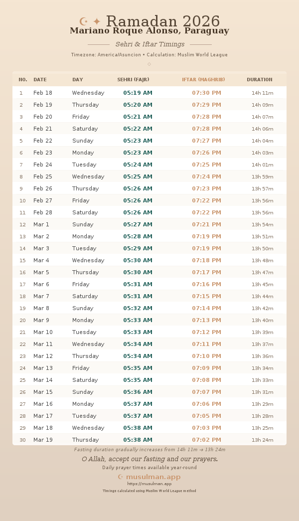 Sehri & Iftar Timings - Mariano Roque Alonso, Paraguay