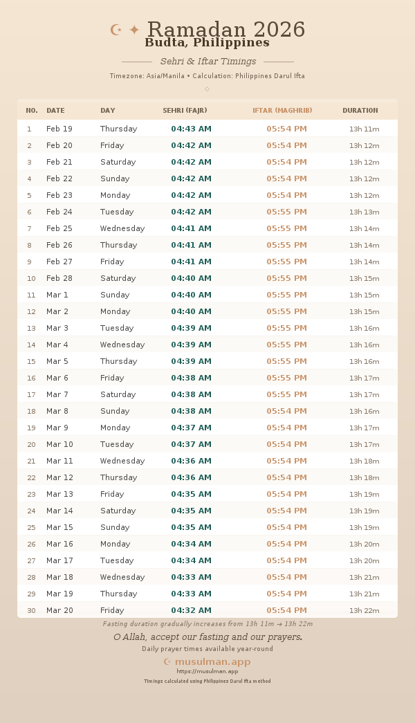 | 1 | Feb 19 | Thursday | 04:43 AM | 05:54 PM | 13h 11m |