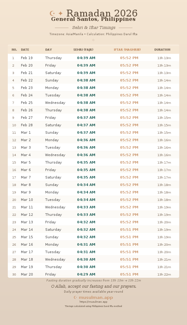 | 13 | Mar 3 | Tuesday | 04:36 AM | 05:52 PM | 13h 16m |
