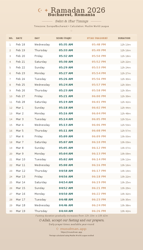 | No. | Date | Day | Sehri (Fajr) | Iftar (Maghrib) | Duration |