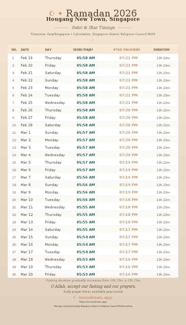 Sehri & Iftar Timings - Hougang New Town, Singapore