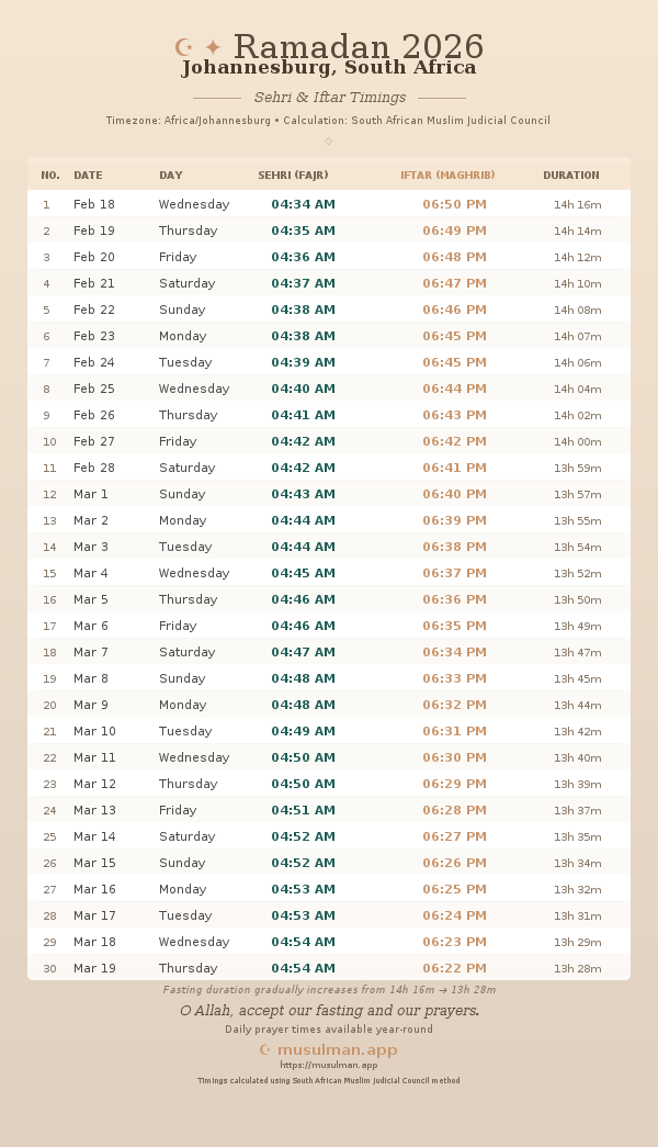 Sehri & Iftar Timings - Johannesburg, South Africa
