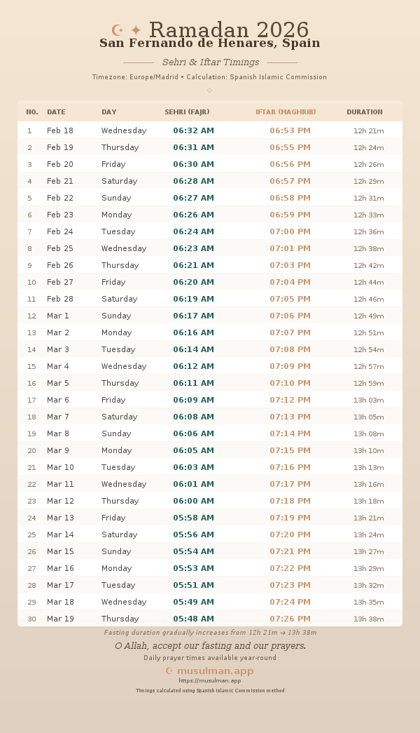 Sehri & Iftar Timings - San Fernando de Henares, Spain