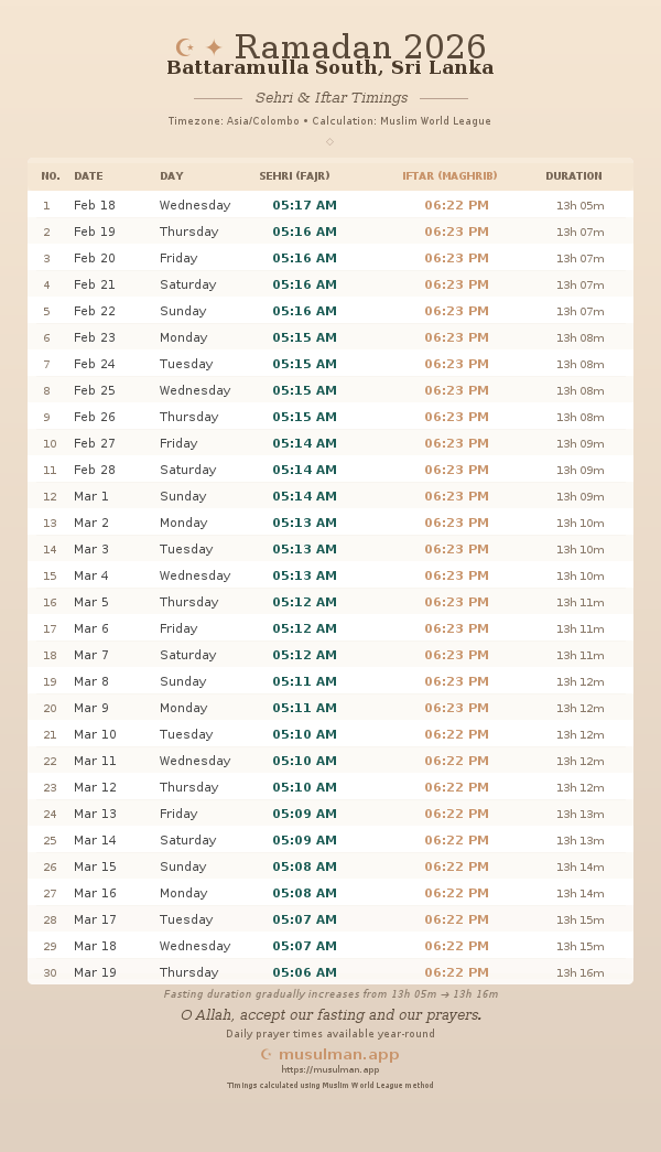 Sehri & Iftar Timings - Battaramulla South, Sri Lanka