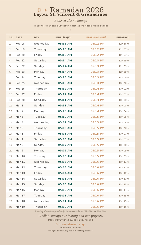 Sehri & Iftar Timings - Layou, St. Vincent & Grenadines