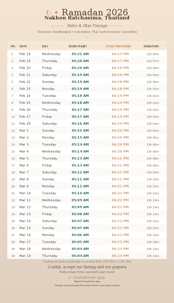 Sehri & Iftar Timings - Nakhon Ratchasima, Thailand