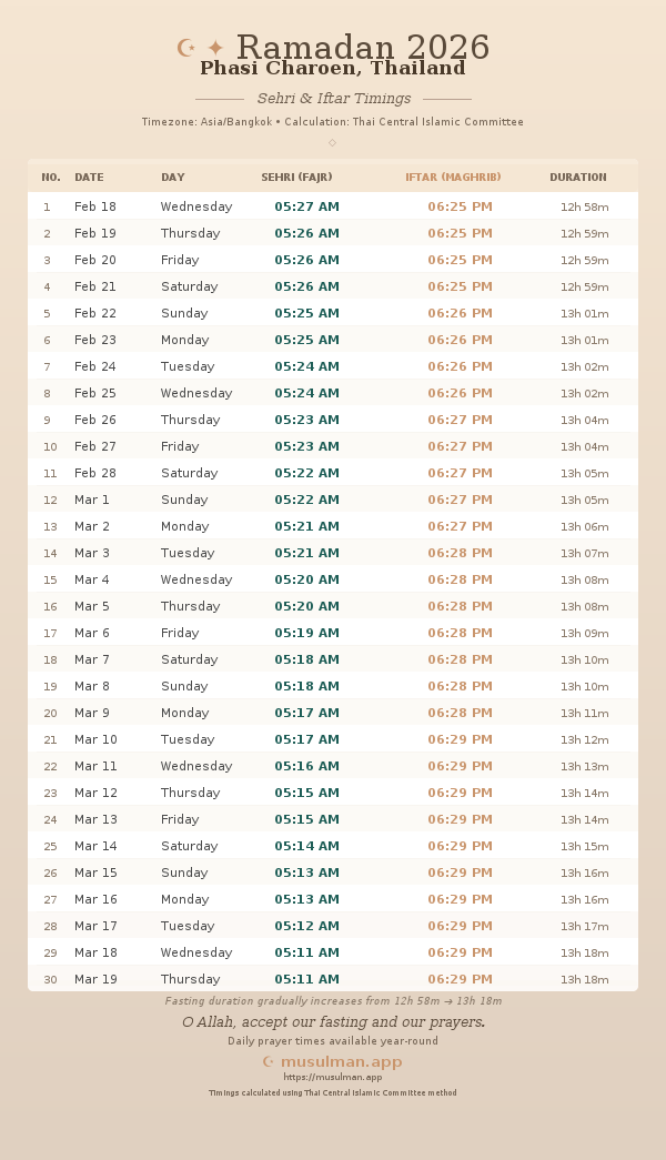 Sehri & Iftar Timings - Phasi Charoen, Thailand