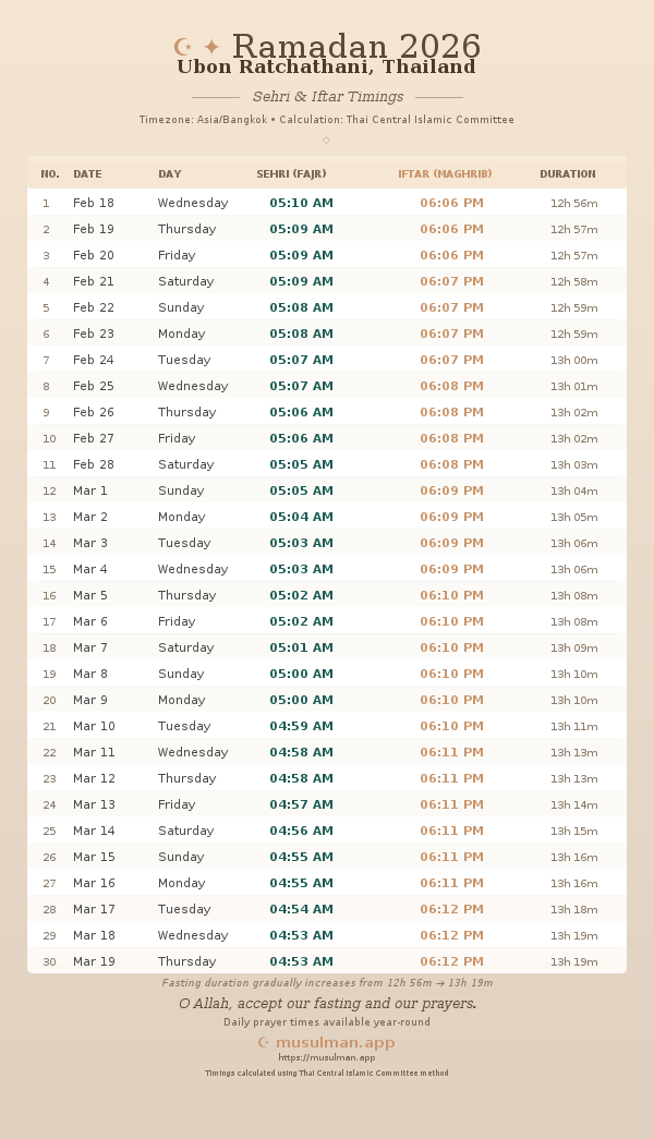 Sehri & Iftar Timings - Ubon Ratchathani, Thailand
