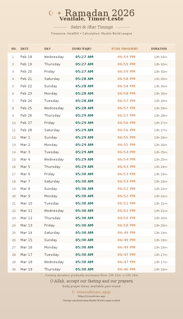 Sehri & Iftar Timings - Venilale, Timor-Leste