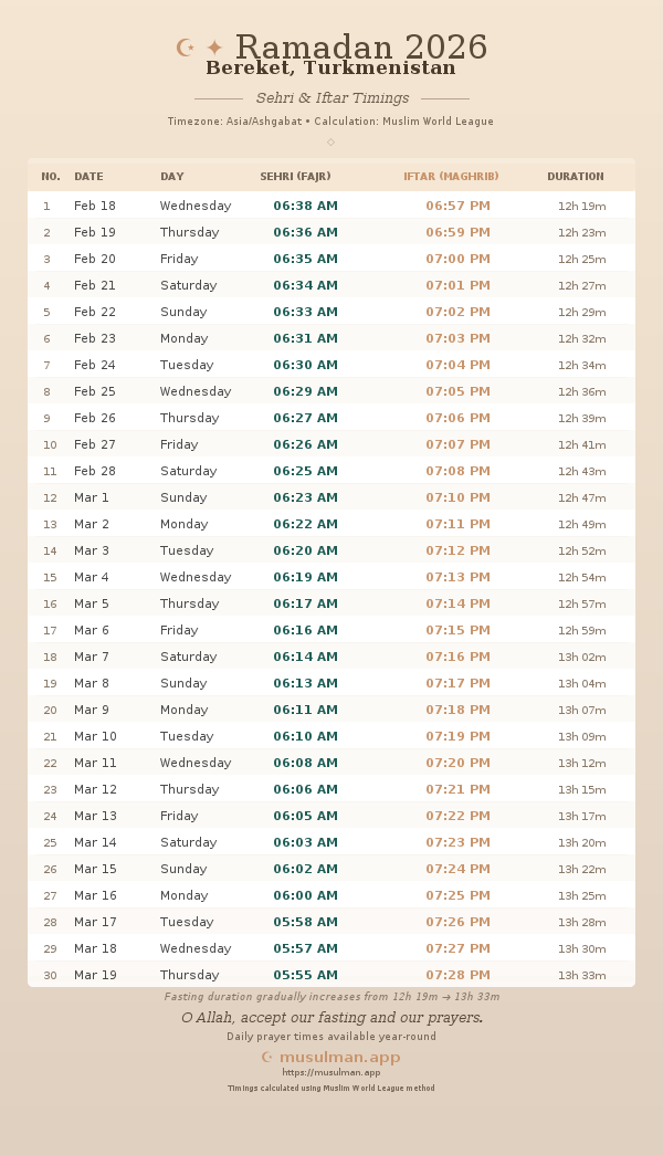 Sehri & Iftar Timings - Bereket, Turkmenistan