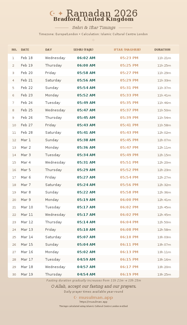 Sehri & Iftar Timings - Bradford, United Kingdom