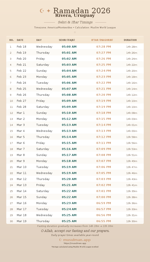 Sehri & Iftar Timings - Rivera, Uruguay