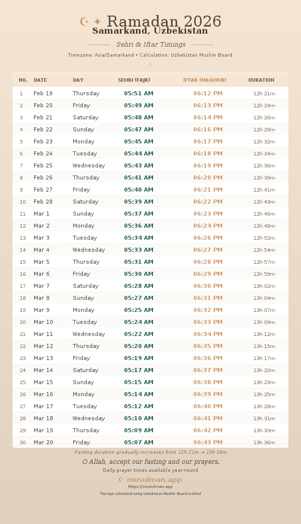 Sehri & Iftar Timings - Samarkand, Uzbekistan